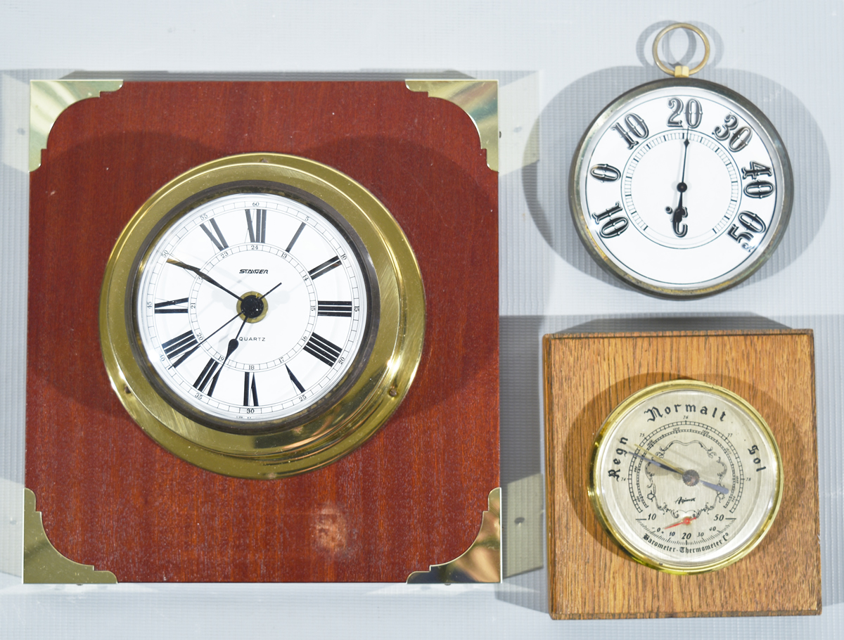 «RELOJ-BAROMETRO-TERMOMETRO» Tres piezas. Miden 12, 8 y 10 cm. de diámetro. Reloj marca Quartz y barómetro marca Agimex. Base u$s 150