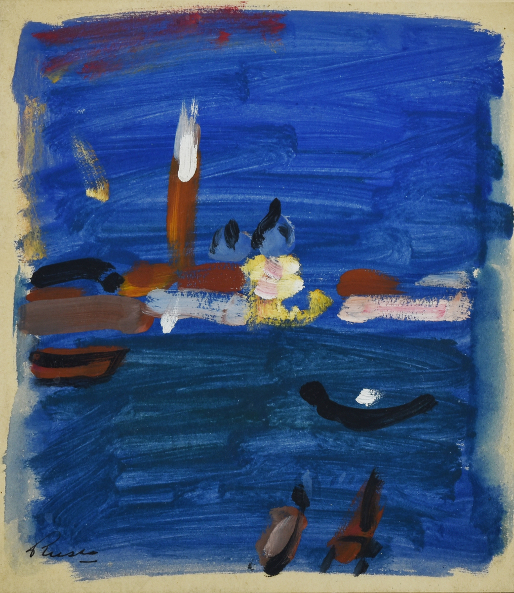 Escuela argentina, 1912 – 1984 «VENECIA» Témpera sobre papel. Mide 19 x 17 cm. Firmada abajo, a la izquierda. Ref.: Con foto certificado de autenticidad emitido por Raúl Russo, hijo del artista, de fecha 6/5/2023. Base u$s 500