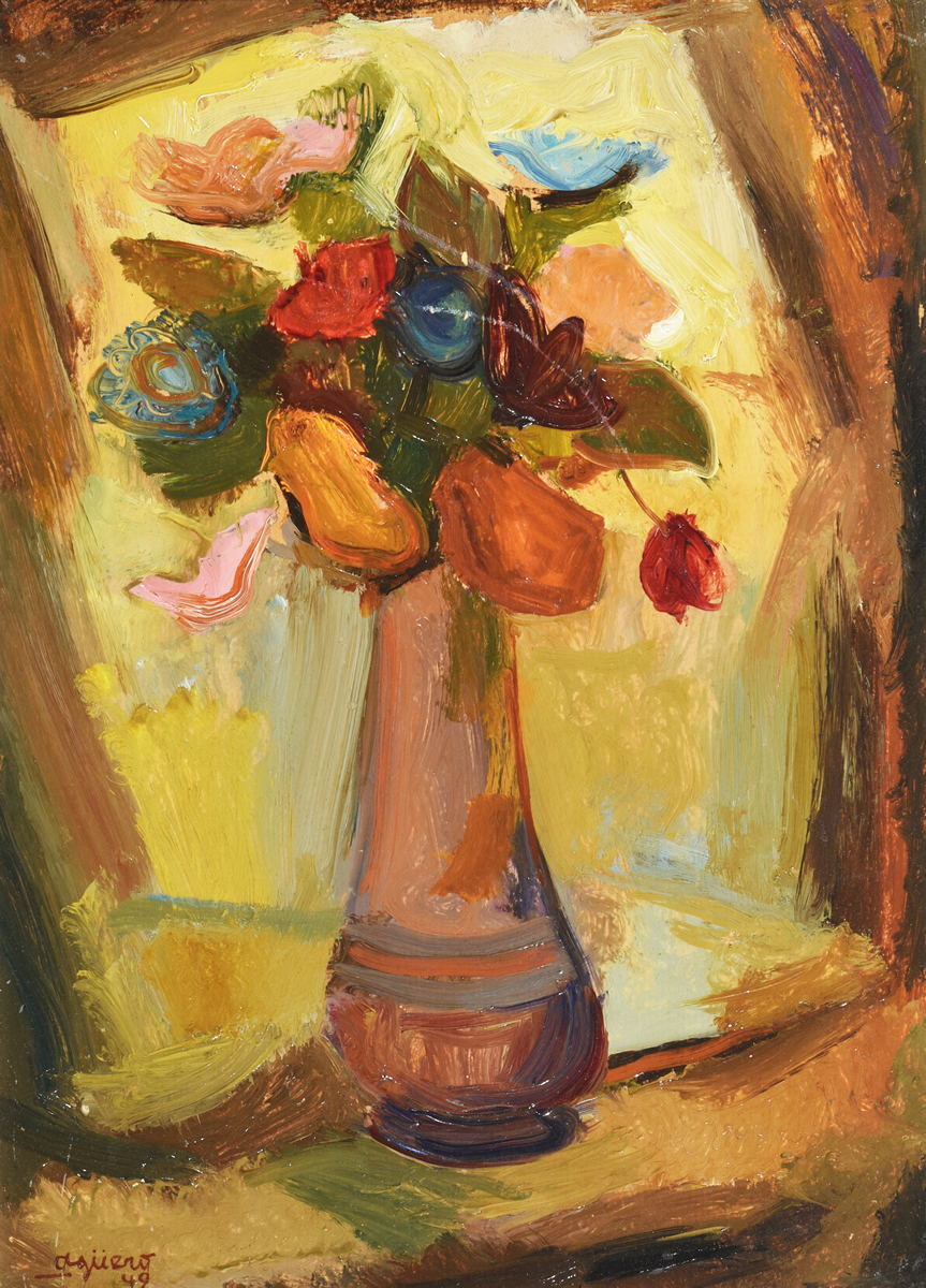 Escuela argentina, 1924 – 1996 «FLORERO» Oleo sobre cartón. Mide 43 x 31 cm. Firmado y fechado «49» abajo, a la izquierda. Base u$s 150