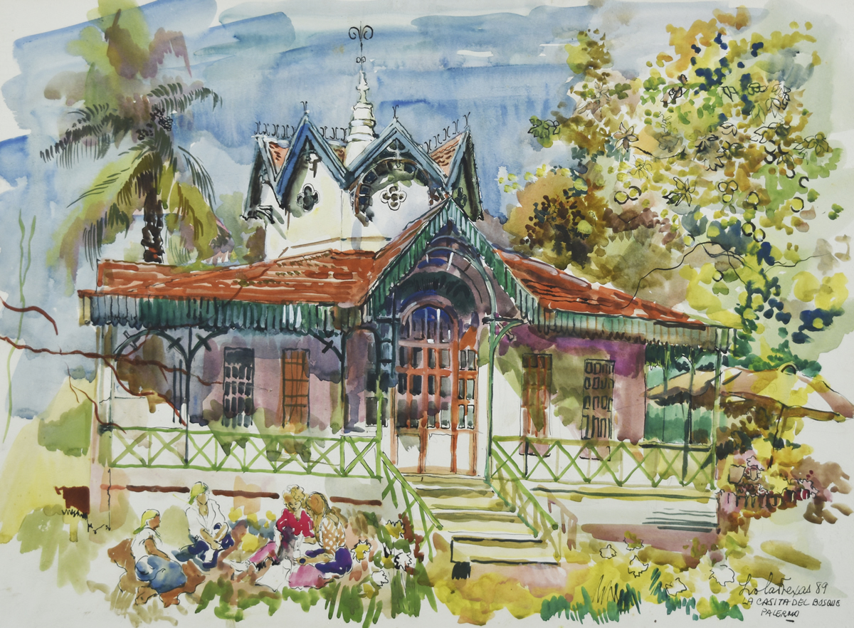 Escuela argentina, 1924 – 2011 «LA CASITA DEL BOSQUE (PALERMO)» Acuarela sobre papel. Mide 48 x 65 cm. Firmada, fechada «89» y titulada abajo, a la derecha. Base u$s 150