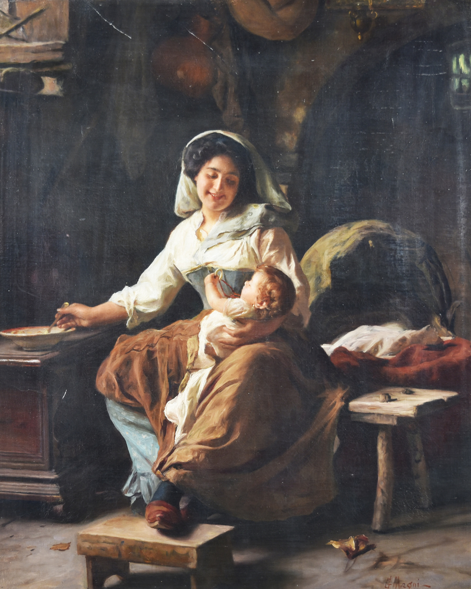 Escuela italiana, 1869 – 1956 «MATERNIDAD» Óleo sobre tela. Mide 55 x 46 cm. Firmado abajo, a la derecha. Base u$s 300