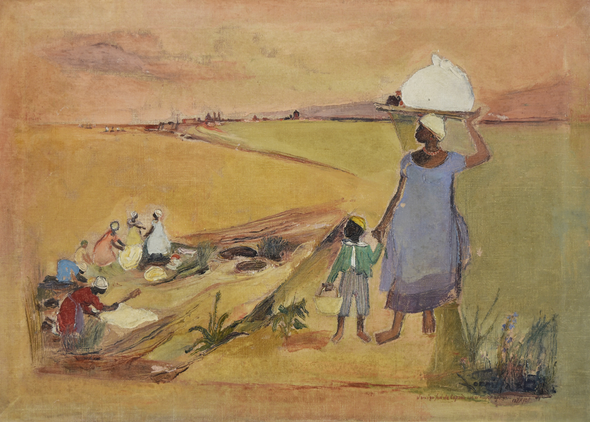 Escuela argentina, 1919 – 2015 «FIGURAS EN LA ORILLA DEL RIO» Óleo sobre tela. Mide 50 x 70 cm. Firmado, con dedicatoria y fechado «61» abajo, a la derecha. Base u$s 400