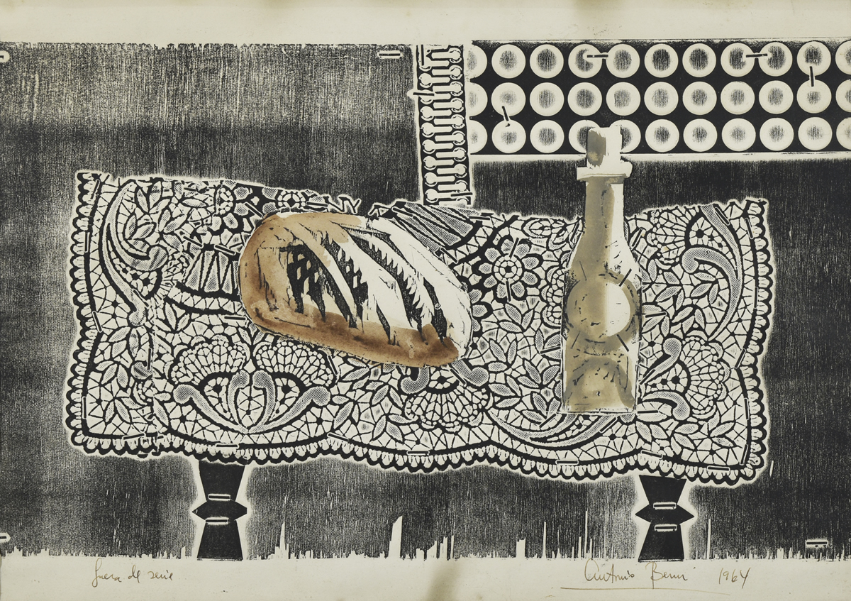 Escuela argentina, 1905 – 1981 «PAN Y VINO» Gofrado sobre papel. Mide 33 x 46 cm. Firmado y fechado «1964» abajo, a la derecha. Con justificación de tiraje «fuera de serie» abajo, a la izquierda. Base u$s 1300