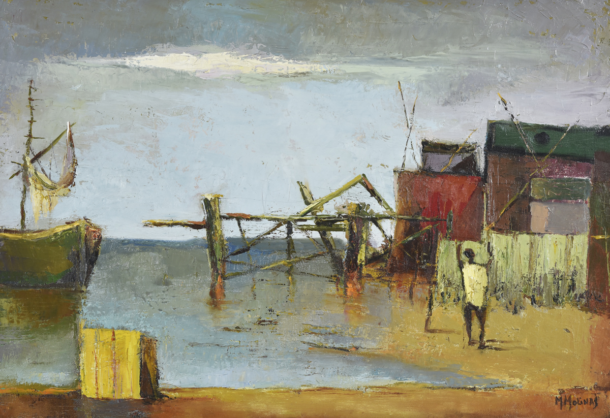 Escuela argentina, 1911 – 1994 «PUERTO VIEJO » Óleo sobre tela. Mide 52 x 76 cm. Firmado abajo, a la derecha. Ref.: Obra titulada, localizada «Santa Fe» y firmada al dorso por el artista. Base u$s 400