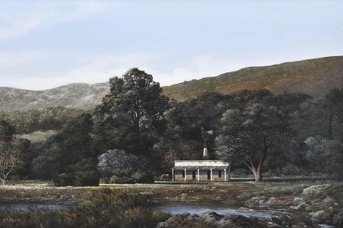 Escuela argentina, contemporáneo. «CASA EN TRASLASIERRA» Óleo sobre tela. Mide 40 x 60 cm. Firmado abajo, a la izquierda. Ref.: Obra titulada, localizada «Córdoba, Argentina 1999» y firmada al dorso, por el artista. Base u$s 1000
