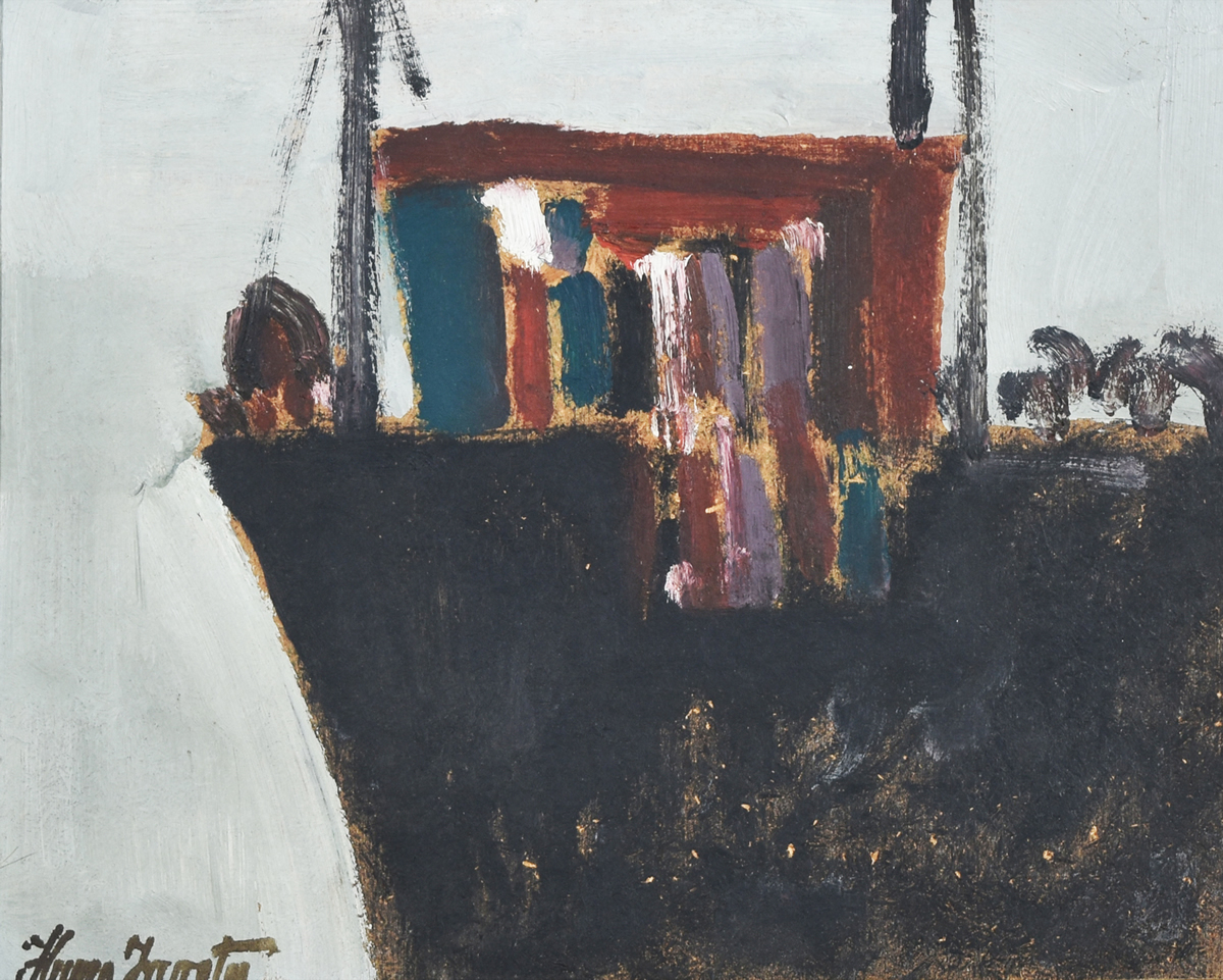 Escuela argentina, 1928 – 2015 «BARCO» Oleo sobre aglomerado. Mide 23 x 29 cm. Firmado abajo, a la izquierda. Ref.: Obra titulada, fechada «1979» y firmada al dorso, por el artista. Base u$s 150