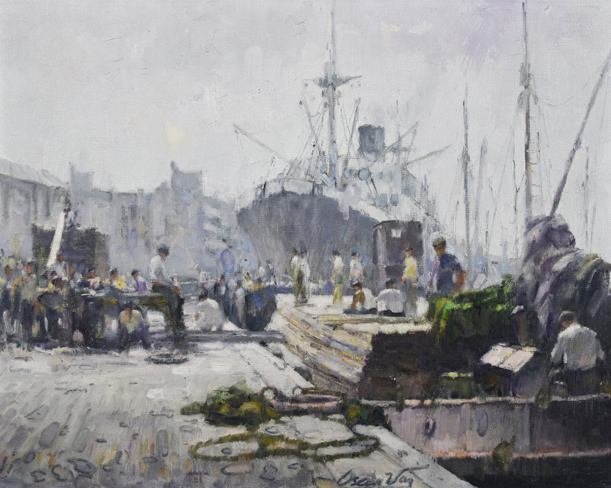 Escuela argentina, 1909 – 1987 «PUERTO» Óleo sobre tela montada en cartón. Mide 40 x 50 cm. Firmado abajo, al centro. Base u$s 800