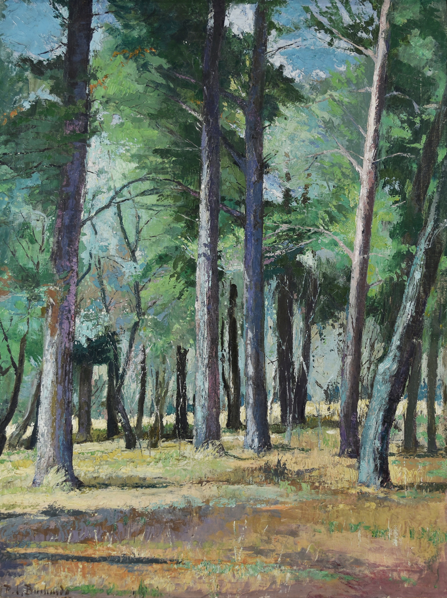 Escuela argentina, 1883 – 1964 «BOSCAJE» Óleo sobre tela. Mide 118 x 90 cm. Firmado abajo, a la izquierda. Ref.: Obra titulada, fechada «1936» y firmada al dorso, por el artista. Base u$s 120