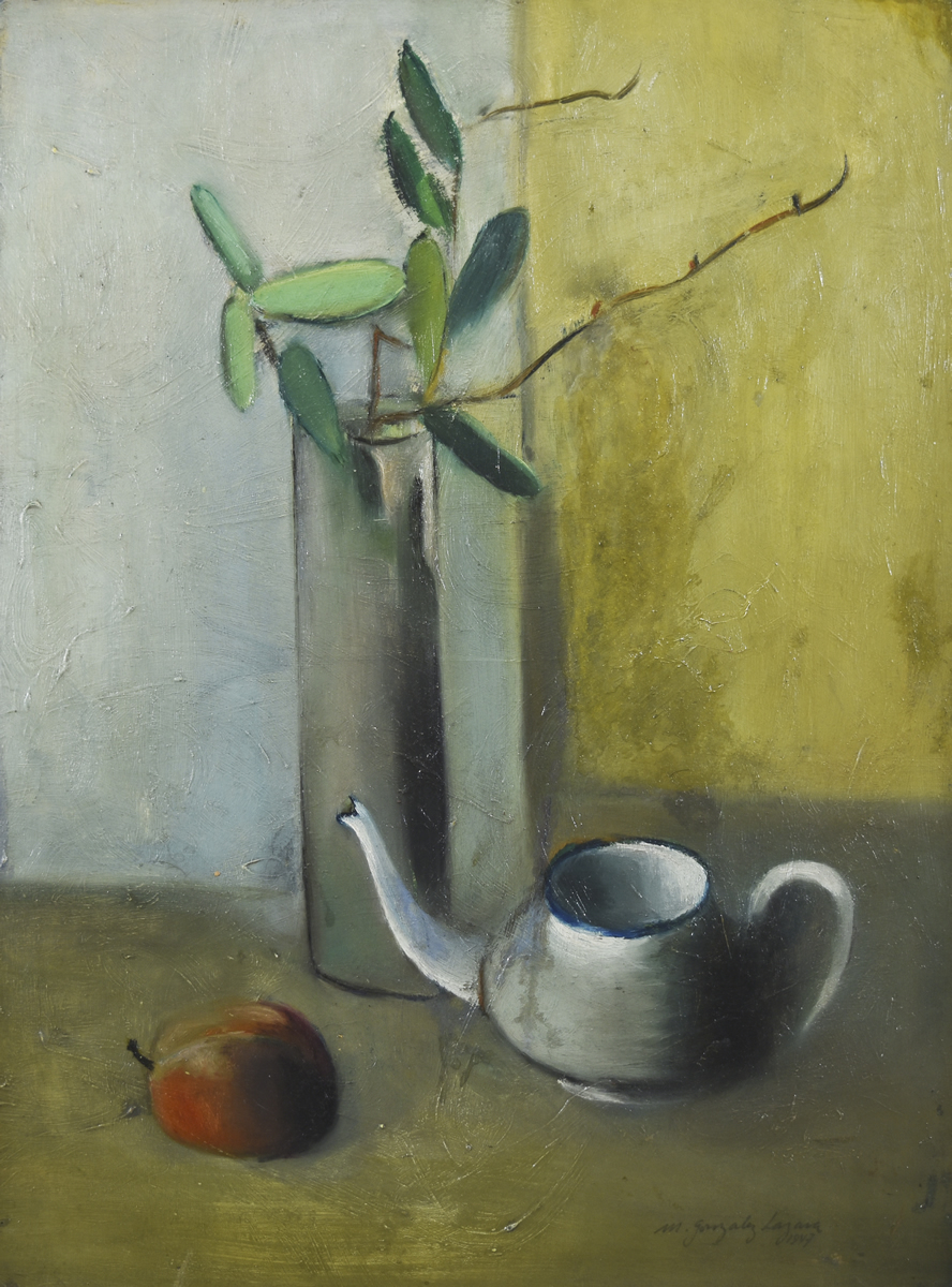 Escuela argentina, 1912 – 1979 «COMPOSICION» Oleo sobre cartón. Mide 48 x 35 cm. Firmado y fechado «1947» abajo, a la derecha. Ref.: Cuenta con otra obra al dorso. Obra sin marco. Base u$s 80