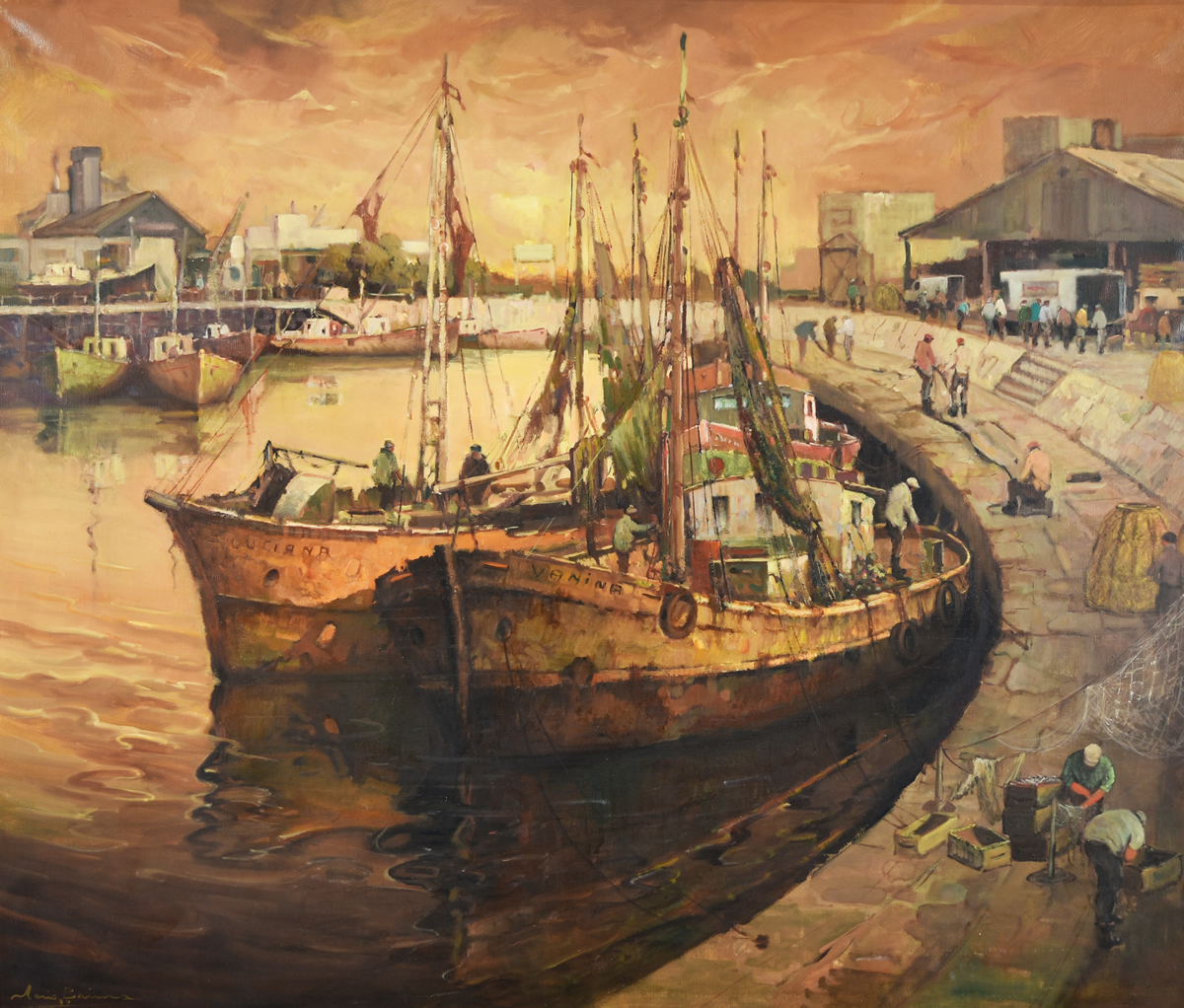 Escuela argentina, 1922 – 2001 «LA VUELTA DE ROCHA» Óleo sobre tela. Mide 85 x 101 cm. Firmado abajo, a la izquierda. Base u$s 300
