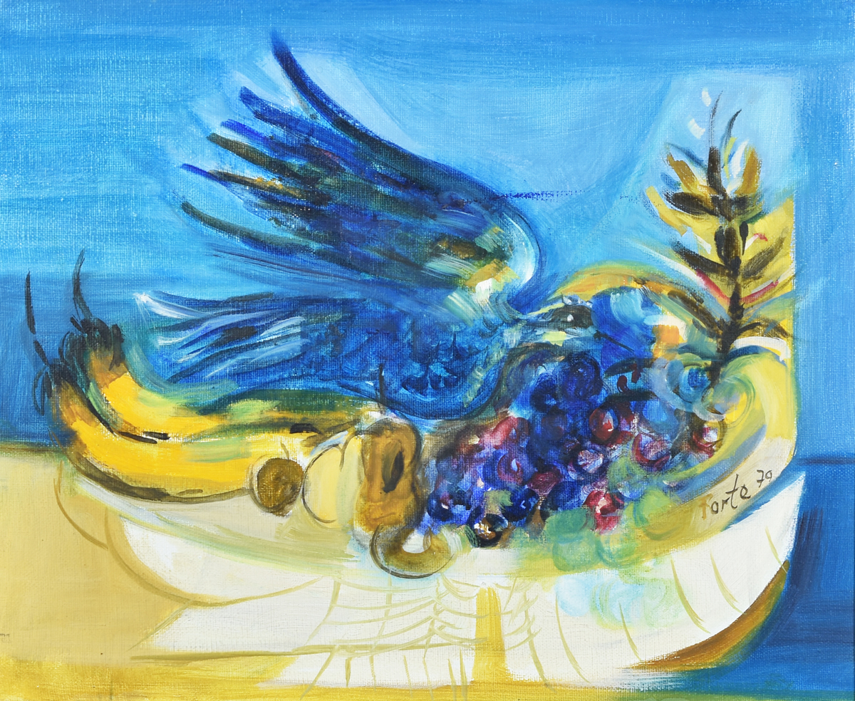 Escuela argentina, 1912 – 1980 «EL PAJARO AZUL» Óleo sobre tela. Mide 25 x 30 cm. Firmado y fechado «79» abajo, a la derecha. Ref.: Obra titulada, fechada «1979» y firmada al dorso, por el artista. Base u$s 250