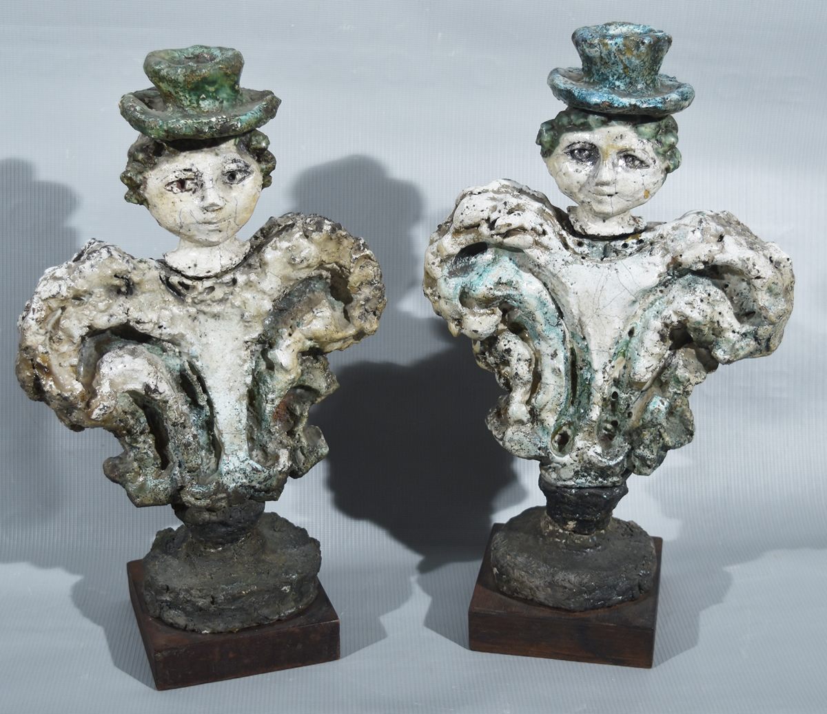 Escuela argentina, 1922 – 2010 «FIGURAS» Par de esculturas de cerámica. Miden 32 cm. de altura cada una. Firmada abajo, a la izquierda, una de ellas y abajo, en su base de madera, la restante. Base u$s 300