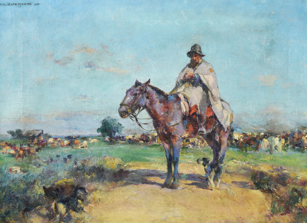 Escuela argentina, 1874 – 1968 «GAUCHO A CABALLO» Óleo sobre tela. Mide 43 x 58 cm. Firmado y fechado «1935» arriba, a la izquierda. Base u$s 300
