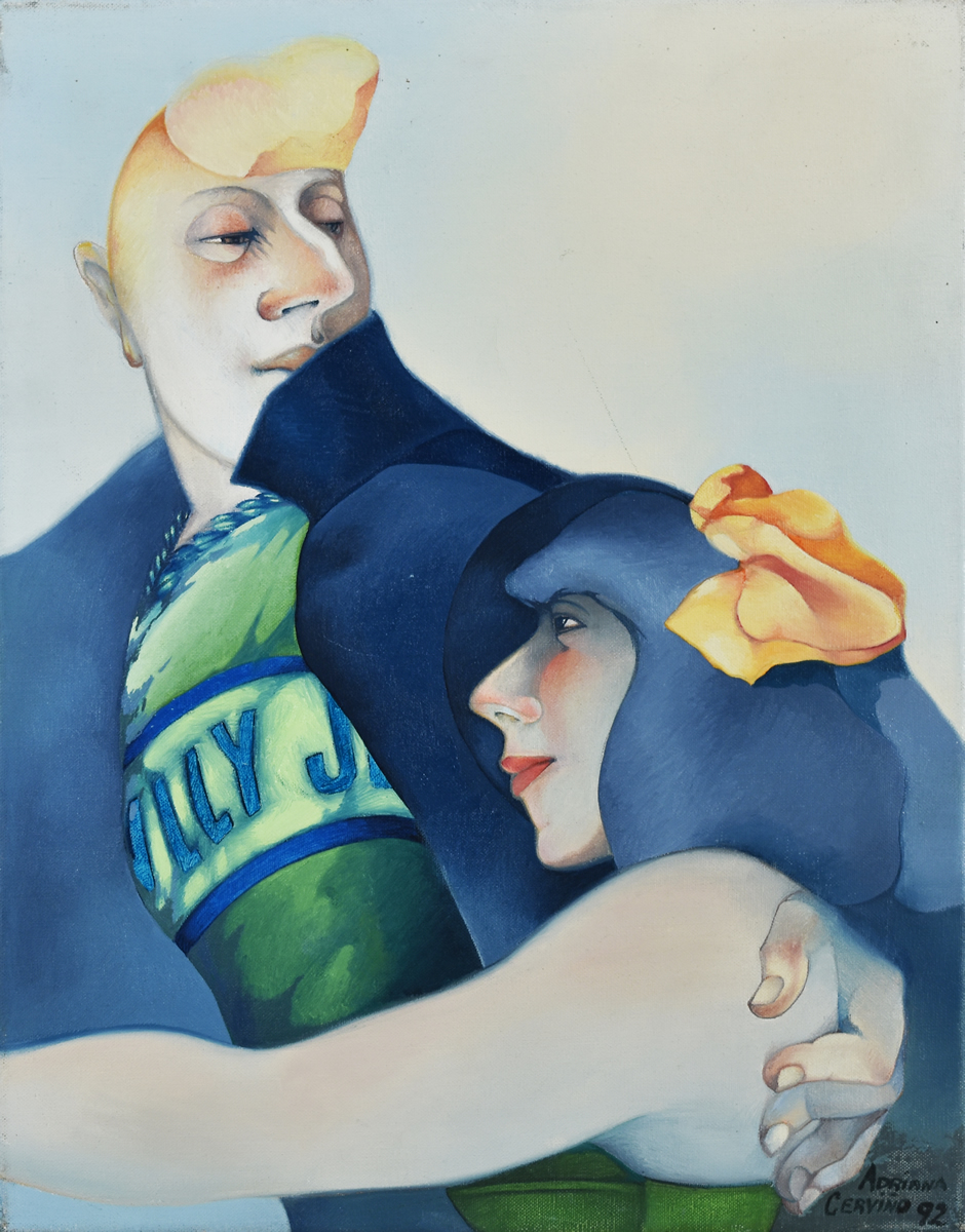 Escuela argentina, contemporánea. «PAREJA» Óleo sobre tela. Mide 40 x 30 cm. Firmado y fechado «92» abajo, a la derecha. Ref.: Obra titulada y firmada al dorso, por la artista. Base u$s 200