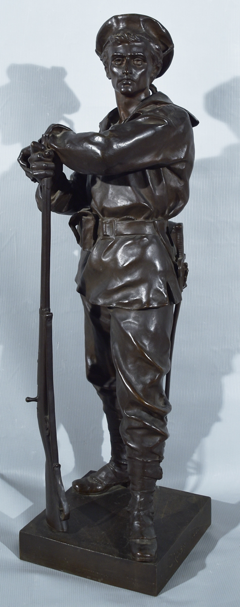 Escuela francesa, 1840 – 1899 «LE FUSILIER MARIN» Escultura de bronce. Mide 73 cm. de altura Firmada y fechada «1886» abajo, a la derecha, en su base. Base u$s 800