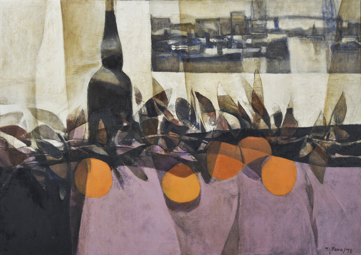 Escuela argentina, 1929 – 1986 «BOTELLA Y NARANJAS» Óleo sobre tela. Mide 50 x 70 cm. Firmado y fechado «78» abajo, a la derecha. Ref.: Obra titulada, fechada «1978» y firmada en el bastidor, al dorso por el artista. Base u$s 350