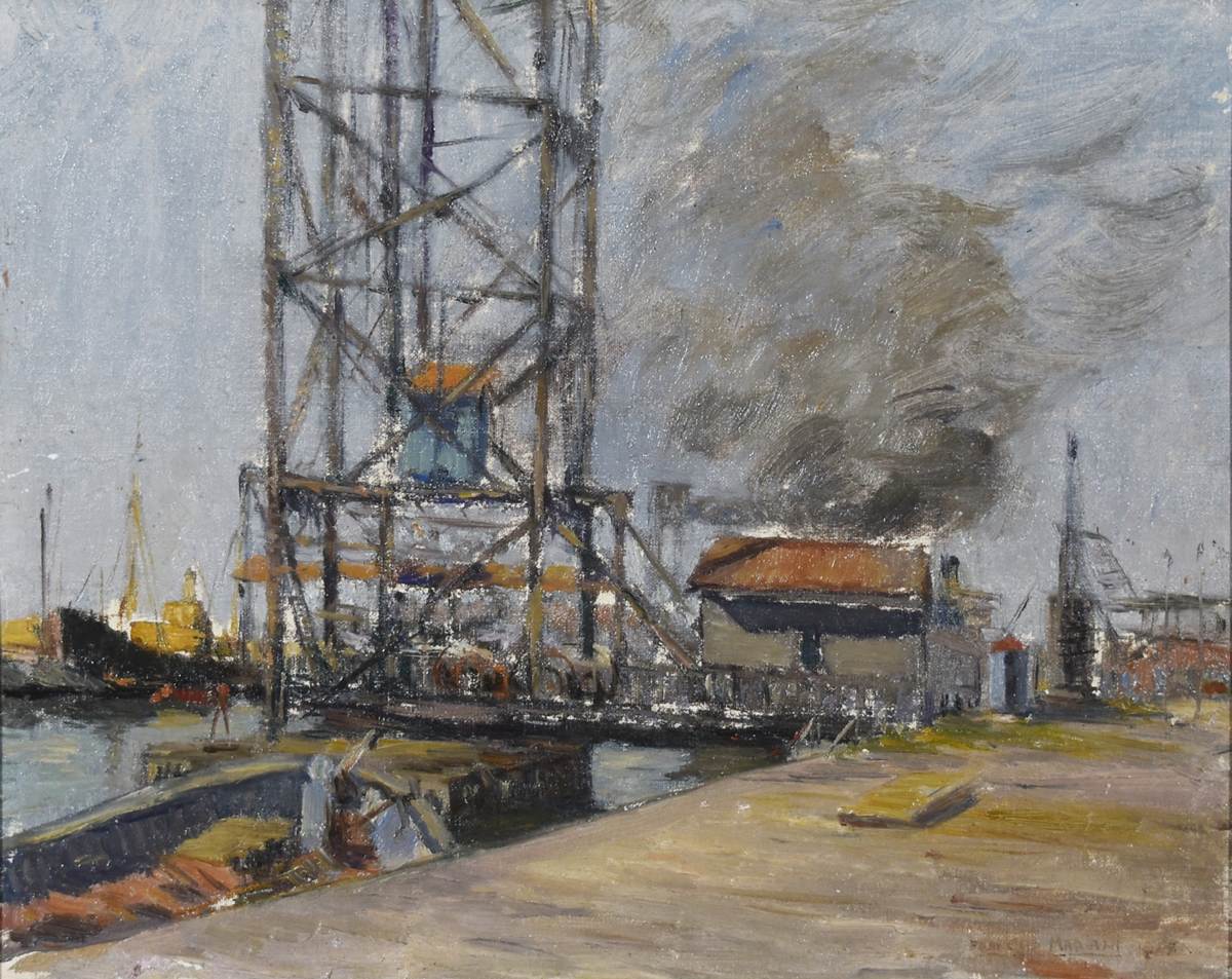 Escuela argentina, 1883 – 1953 «RIACHUELO» Óleo sobre tela montada en cartón. Mide 27 x 34 cm. Firmado y fechado «1947» abajo, a la derecha. Base u$s 100