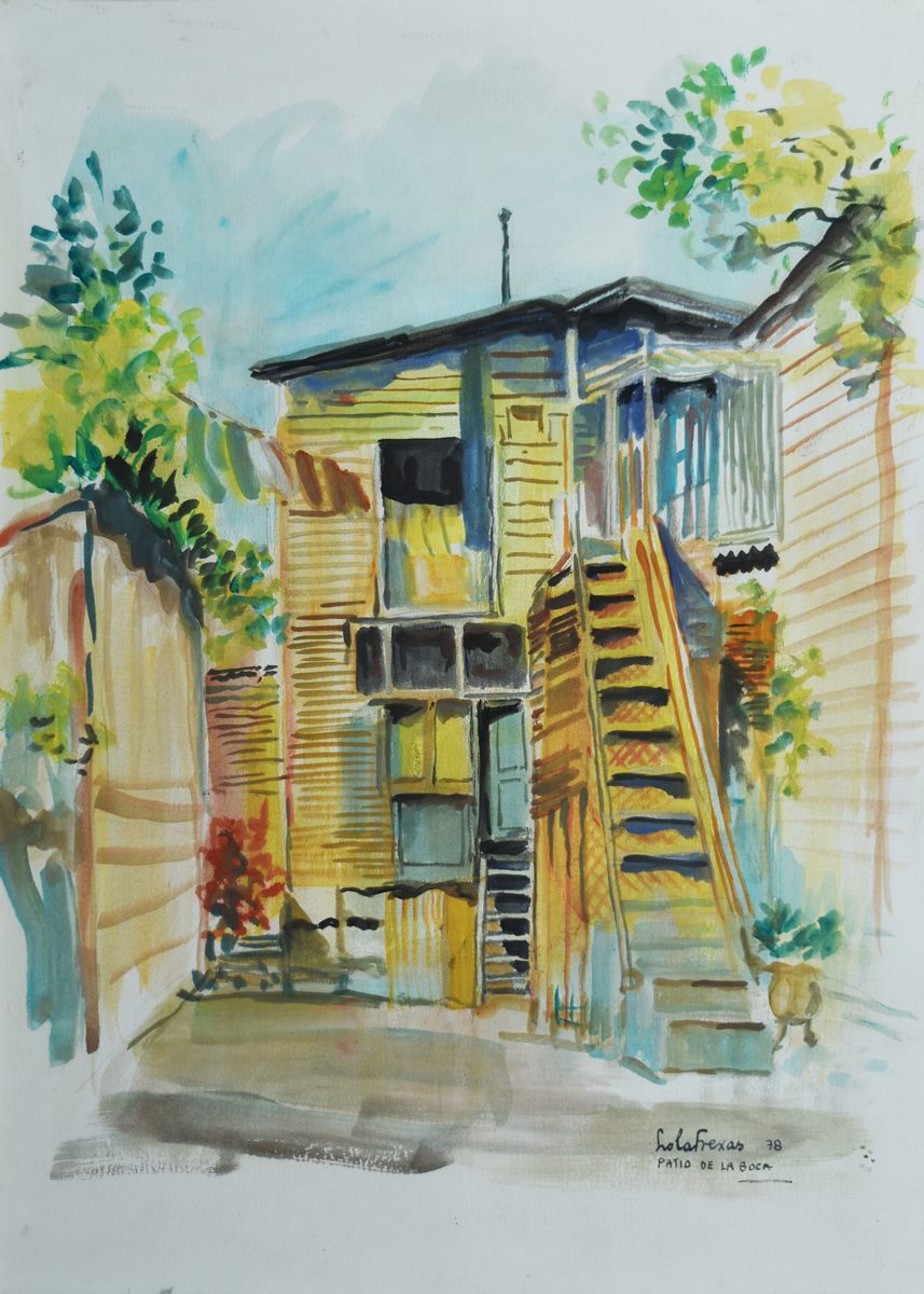 Escuela argentina, 1924 – 2011 «PATIO DE LA BOCA» Acuarela sobre papel. Mide 69 x 49 cm. Firmada, fechada «78» y titulada abajo, a la derecha. Base u$s 250